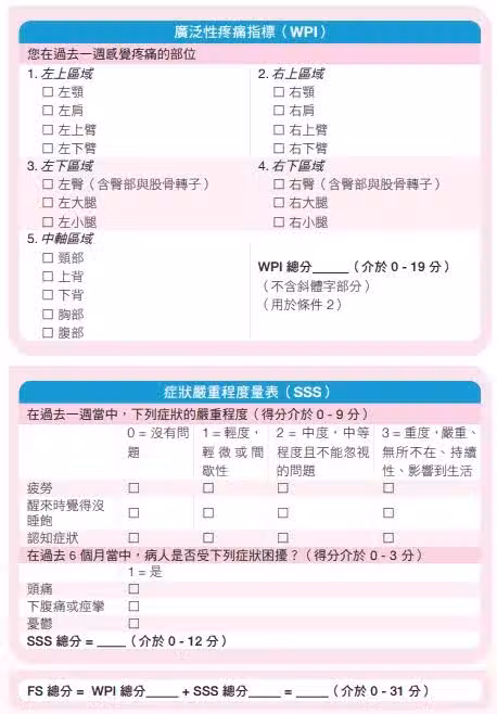 1. 廣泛性全身疼痛(WPI):指定痛處共19處,分為5個區域,至少要4個區域出現1個以上的痛點(分數須達4分以上)。