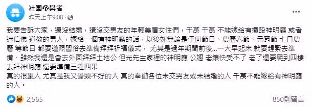 「經歷過的就會懂,沒經歷過的只會嘴別人...我婆家的神明桌在四樓,沒有一個媳婦願意,都說忙沒空...我自己又洗又煮又爬上爬下,直到我生病,才換老公處理。」但也有網友指出,關鍵並非神明廳,而是夫家人態度「老公還有呼吸嗎?」、「遇到的婆家很奇葩。」、「信仰本身沒有對錯,錯的是人的心。」、「娶了媳婦全家變成X廢,到底神明是誰家的?」