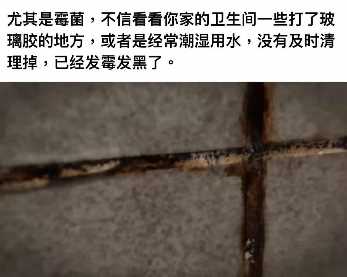 [8/14] 尤其是黴菌,不信看看你家的衛生間一些打了玻璃膠的地方,或者是經常潮濕用水,沒有及時清理掉,已經發霉發黑了。