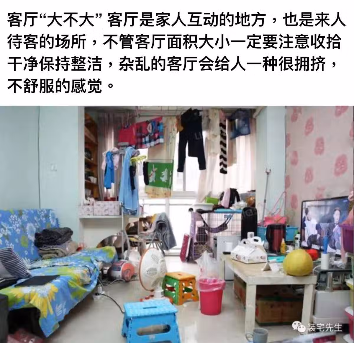 客廳是家人互動的地方,也是來人待客的場所,不管客廳面積大小一定要注意收拾干凈保持整潔,雜亂的客廳會給人一種很擁擠,不舒服的感覺。
