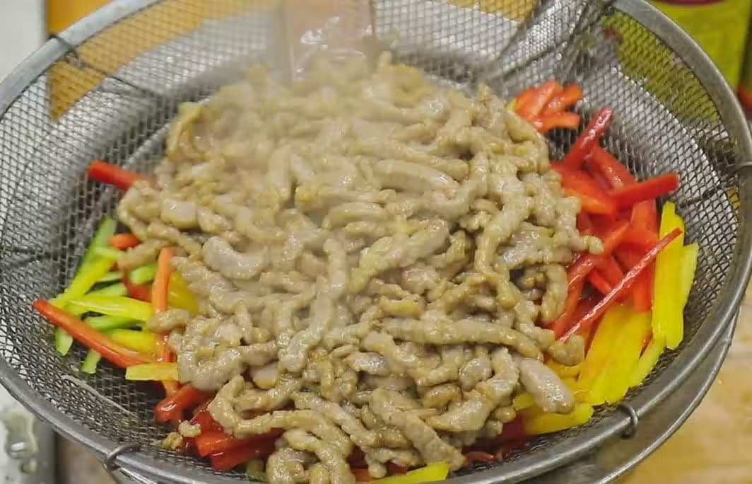 4、準備黃椒、紅椒以及青椒,全都切成細絲,搭配顏色,營養更豐富。趁著熱油把辣椒絲也激一下,這樣顏色和口感都會更好。