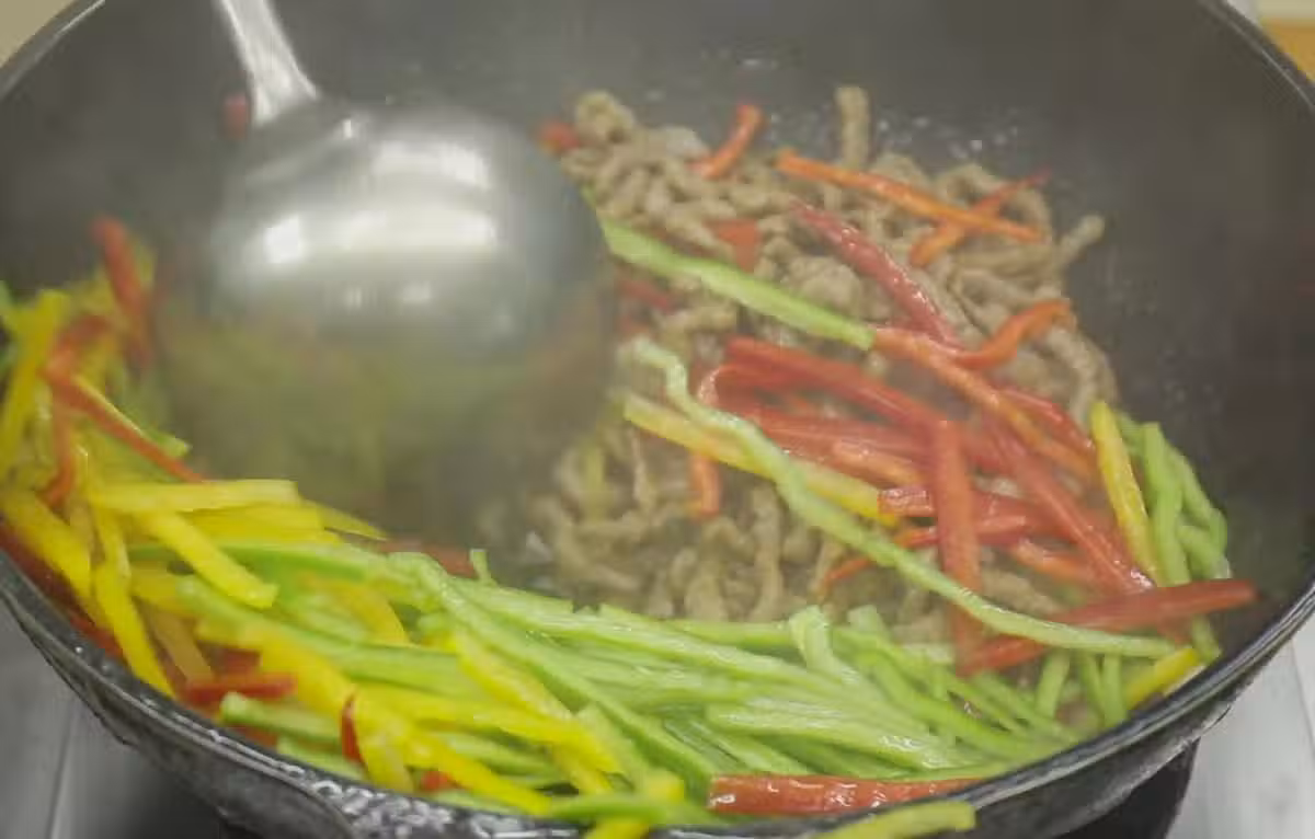 5、鍋里留底油,放蔥薑片爆香,加蠔油、生抽調味,稍微來一點清水化開,把牛肉以及彩椒絲都倒進去,用最大火翻炒30秒鐘,讓肉香味和椒香味融合在一起,再加點雞粉、食鹽補味大,火翻炒均勻,芶入一點水澱粉,讓料汁滿滿當當都裹在牛肉絲上,即可出鍋