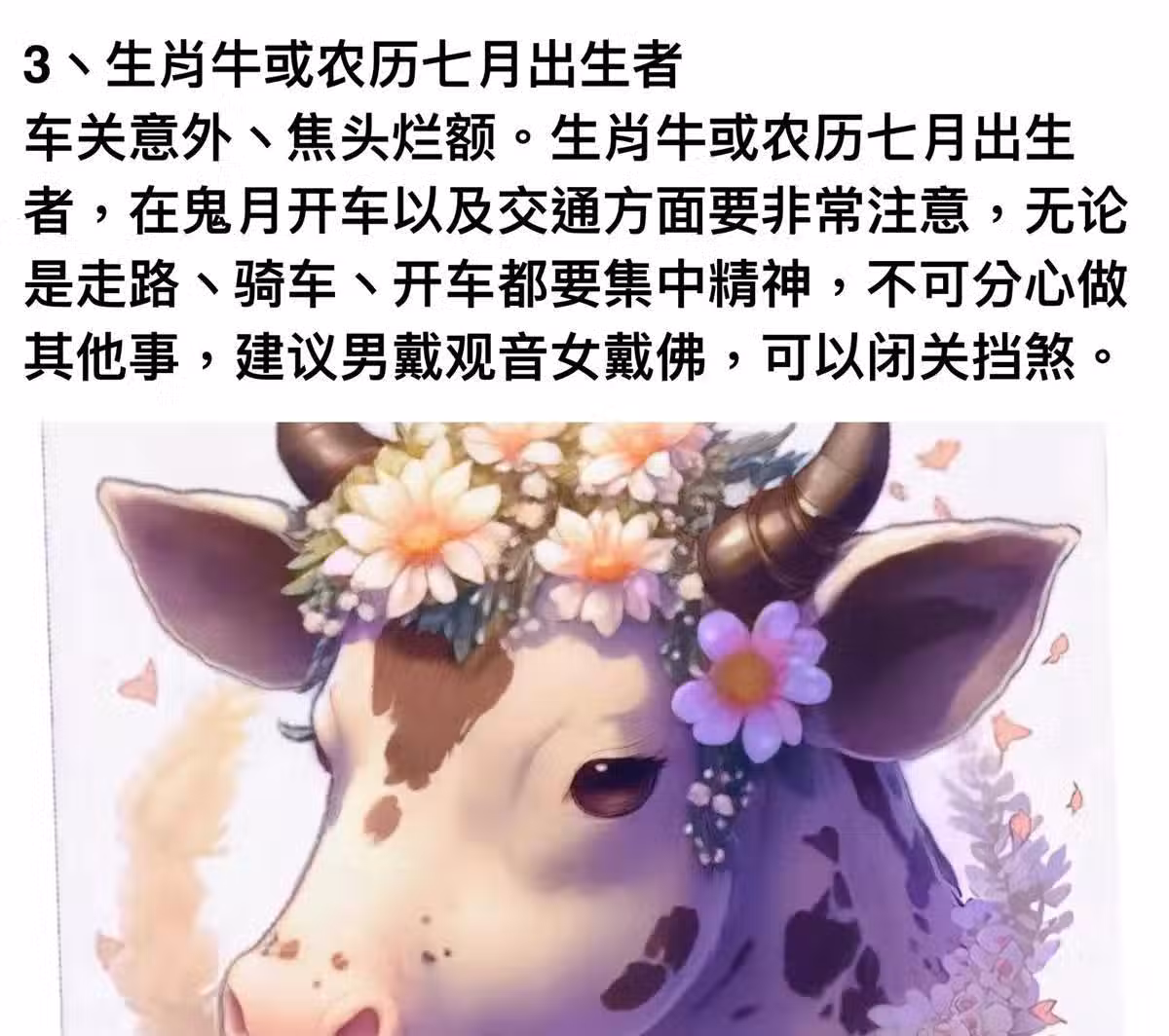 車關意外丶焦頭爛額。生肖牛或農歷七月出生者,在鬼月開車以及交通方面要非常注意,無論是走路丶騎車丶開車都要集中精神,不可分心做其他事,建議男戴觀音女戴佛,可以閉關擋煞。