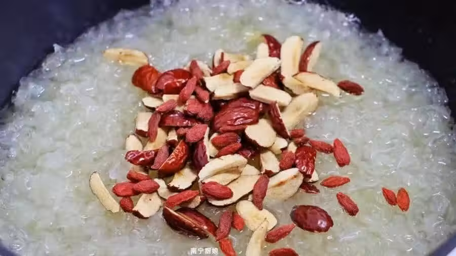 4、銀耳燉好之後,再加入枸杞和去核的紅棗,繼續開中小火慢燉5~10分鐘,把紅棗和枸杞都燉軟。