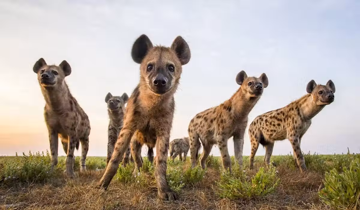 為了生存,斑鬣狗採取了群居的方式,其中雌性是種群首領,雄性的地位非常低,在狩獵過程中,斑鬣狗會瞄準種群內的老弱病殘,會團隊協作將它們驅離種群,否則食草動物種群內的強壯個體就會保護它們。