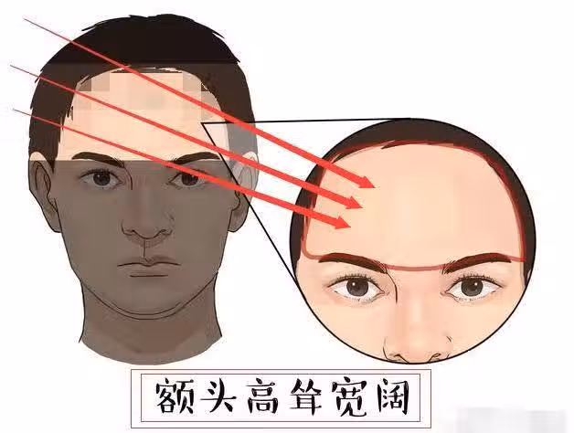 為了方便閱讀,我們後文就將上停均稱為額頭。額頭部位代表一個人的早年運勢,先天智慧,所以從額頭情形可以判斷一個人的分析力、記憶力和觀察力等。如果額頭高聳、寬闊,這樣的人善於思考且富有智慧。這類人無論做任何事情都善於謀劃,所以在工作中能夠取得好的成績,也就更容易在年輕時期闖出一番事業。所以在面相中認為:額頭外形出色的人容易獲得富貴。