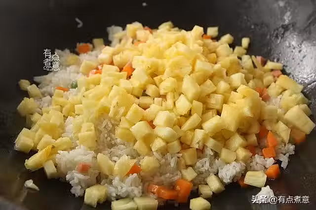7、把準備好的米飯倒入鍋內。再倒入菠蘿,放入半茶匙的鹽翻炒均勻。米飯最好提前煮好,煮好的米飯要攪散熱,徹底晾涼,使米飯粒粒分明。隔夜的剩飯最適合用來炒飯。
