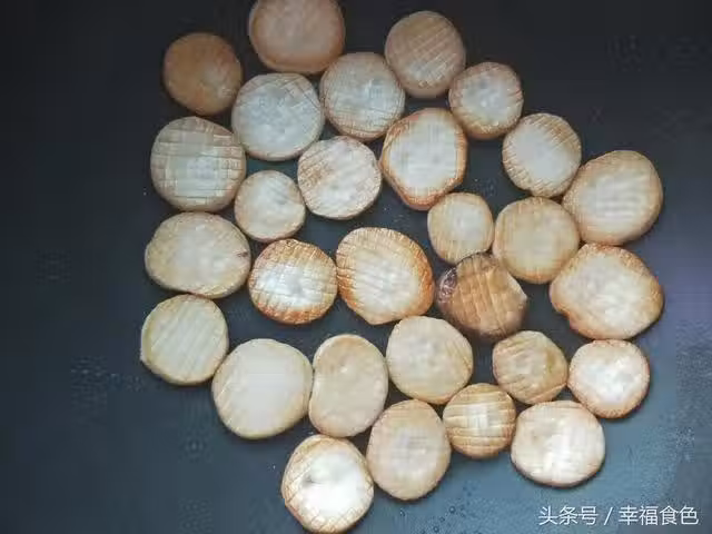 8、然後將煎好的杏鮑菇放下去翻炒均勻,杏鮑菇會吸收蒜香,吃起來也更加的可口。
