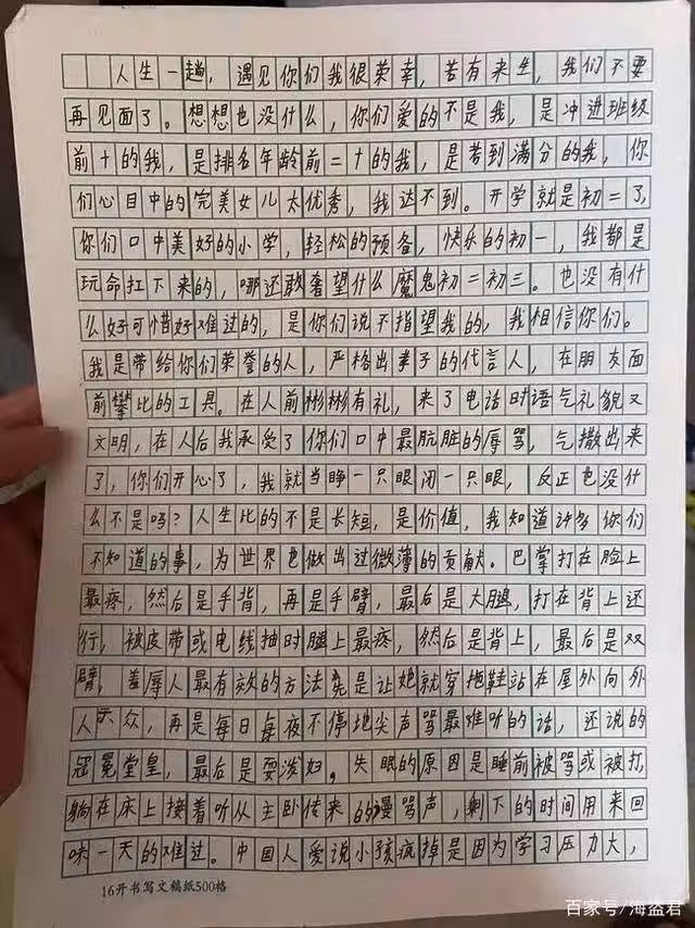 對於爸媽長期嚴厲的要求,該女孩也在遺書中說道:「你們愛的不是我,是衝進班級前10,年級排名前20的我,是考到滿分的我,你們心目中的完美女兒太優秀,我達不到」、「我只是一個給你們帶來榮耀,在你們在朋友面前攀比的工具」。
