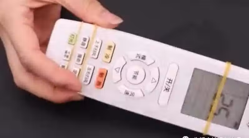 平時我們都會將電視遙控器或者是空調遙控器放在桌上,這樣如果不小心滑動它的話,就會非常容易掉落了,這時候就可以用到皮筋了,我們將皮筋頭尾給它纏上,像這樣纏住以後,邑器就不會再滑動了,如果滑動的話,就算掉到地上也不會分裂。