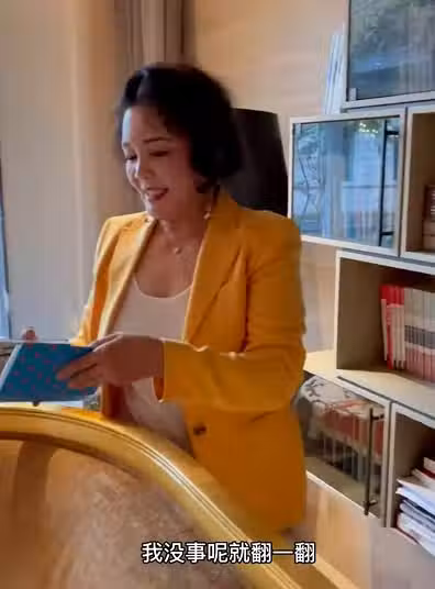 視頻中,62歲的張蘭身穿黃色小西裝,滿頭黑髮,臉上化著精緻的妝容,根本看不出來是花甲之年的人,她從身後的書櫃裡拿出一本相冊,滿眼歡喜地翻閱起來。