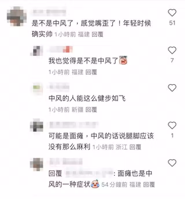 更有網友見馬景濤在畫面中嘴歪明顯無法控制,憂心他是否出現面癱,疑似中風前兆,有人關心詢問:「怎麼感覺左邊有點面癱了、是不是中了風呢? 嘴歪眼斜。」不過被粉絲反駁指:「中風還能健步如飛嗎?」還有不少網友勸馬景濤早日退休。