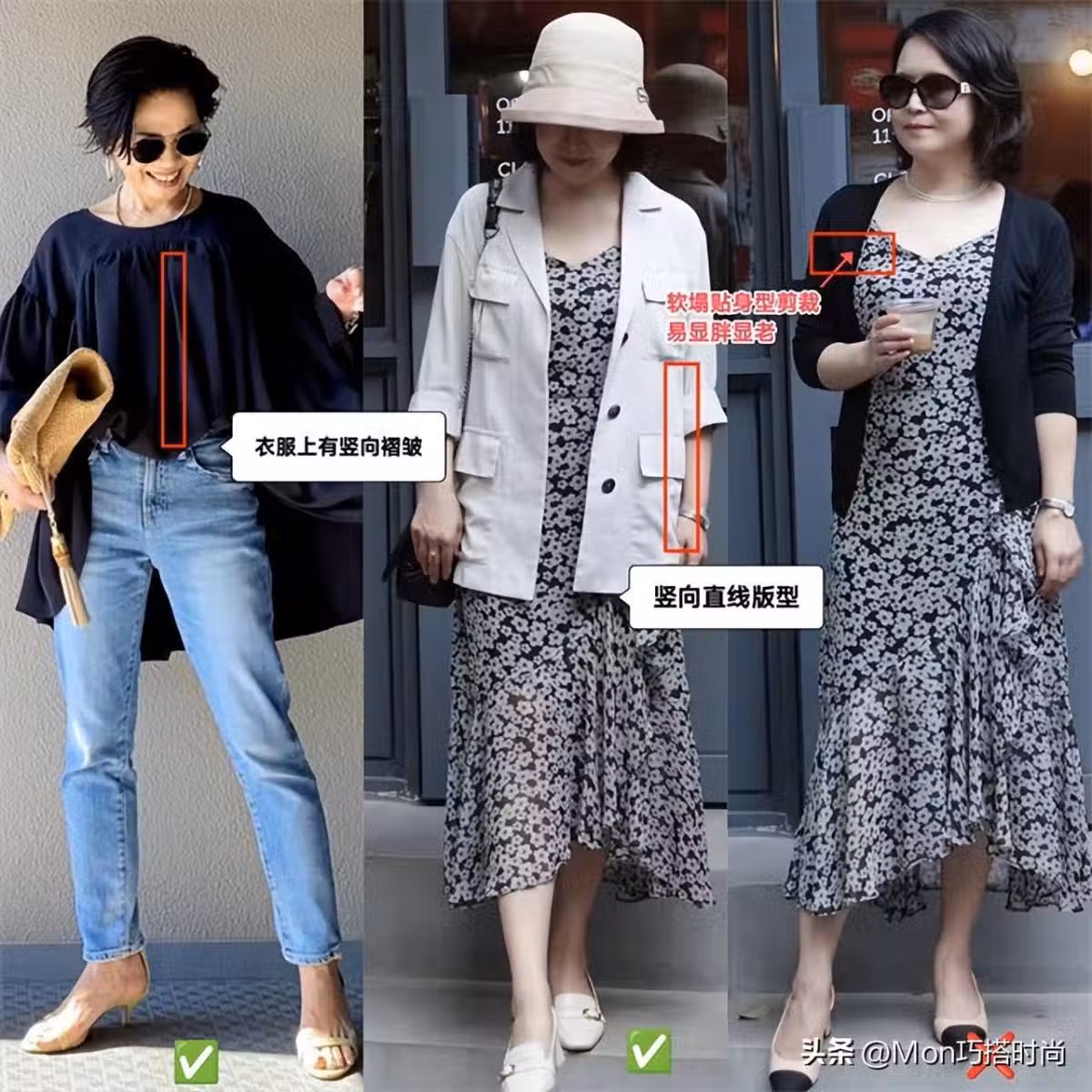 比如同樣一條碎花裙,配硬挺的H型亞麻外套,整體就清爽顯瘦。配貼身的奶奶衫,上衣的軟塌感立馬讓人原地胖五斤!