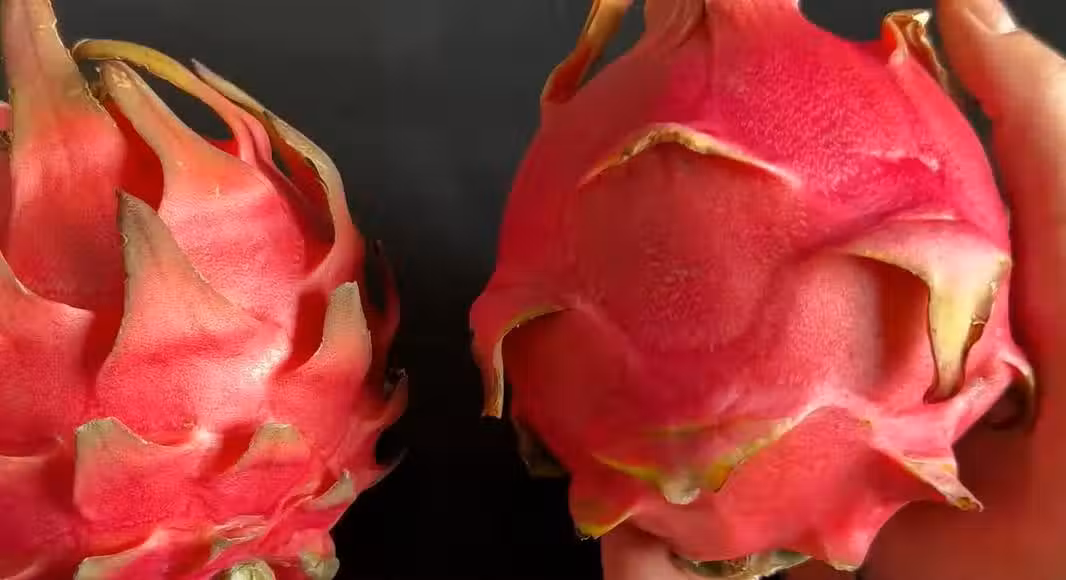 我們要挑選種紅色比較多,只有肩部部分是綠色的,這樣火龍果才比較成熟,比較好吃,同時它葉片,如果外翻的話,證明火龍果會很甜。