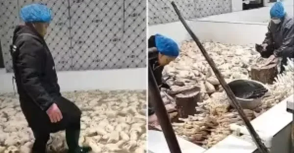 她拍下食品生產間一幕, 工人「腳踩製作」讓人不忍直視, 網哀嚎:我昨天才買來吃
