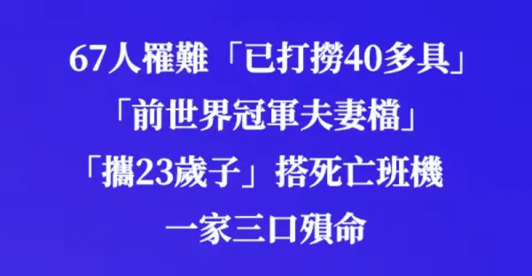 67人罹難「已打撈40多具」!「前世界冠軍夫妻檔」攜23歲子搭死亡班機 一家三口殞命