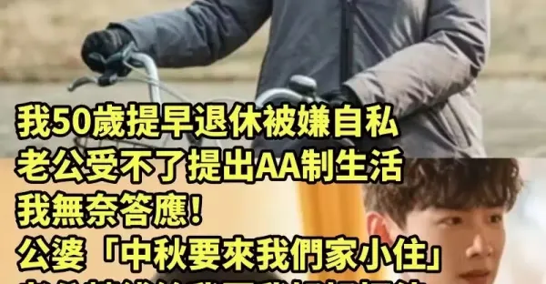 我50歲提早退休被嫌自私「老公受不了提出AA制生活」我無奈地答應! 公婆「中秋要來我們家小住」老公轉錢給我要我好好招待,我沒正面回應「當天笑笑做一件事」家庭群組吵翻了 #誰有理呢