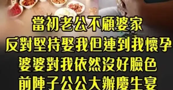 當初老公不顧婆家 反對堅持娶我! 但連到我懷孕 婆婆對我依然沒有好臉色...前陣子公公大辦慶生宴 我挺九個月孕肚忙進忙出 開飯時我 「當眾放出一段錄音」 婆婆臉綠了