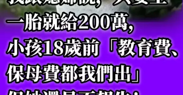 我跟媳婦說,只要生一胎就給200萬,小孩18歲前「教育費、保母費都我們出」,但她還是不想生!急死我們了…到底要開什麼條件?年輕人才願意生