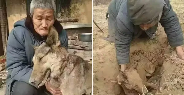 15歲老狗臨終前緊緊靠在老人懷里,老人含淚埋葬狗狗,讓人淚奔