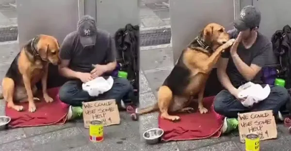 男子帶狗狗一起流浪,喂狗狗食物時,狗狗讓主人先吃,牠好懂事