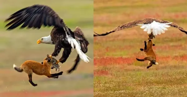 紅狐活捉野兔卻被白頭鷹搶走,不甘心向前竟被帶到空中,記仇紅狐將白頭鷹老巢一窩端!