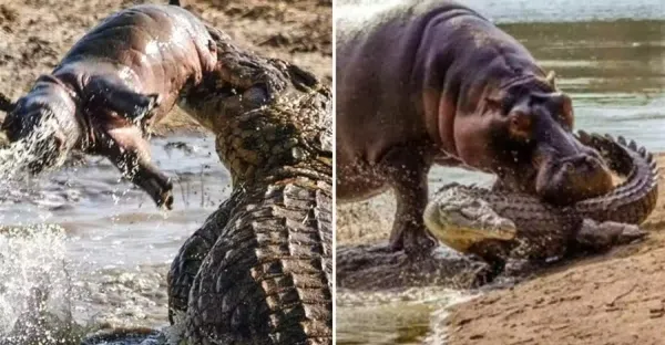 帥不過三秒!鱷魚偷襲小河馬霸氣狂甩,暴怒母河馬下秒趕到「泰山壓頂」,一分鐘送鱷魚上西天