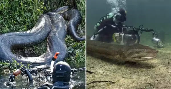 小夥潛水偶遇8米森蚺,身材粗長眼睛放光,冒死零距離拍照 光看著就令人毛骨悚然