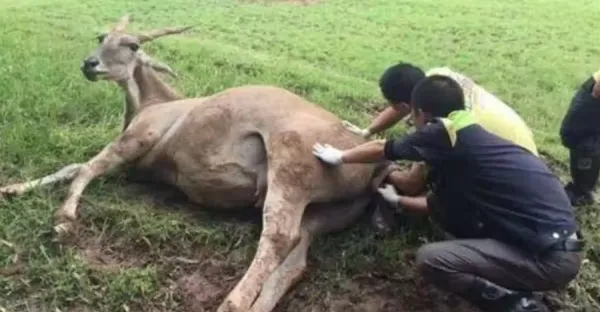 母羚羊難產生不出,攝影師忙上前幫助,但看到生出的東西,全都傻眼了