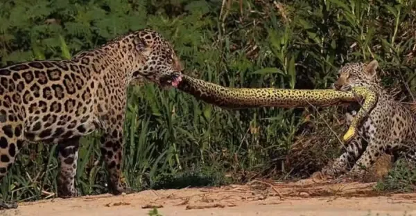 偶遇「4米長森蚺」 美洲虎母子齊上陣,蛇頭蛇尾「雙管齊下」,森蚺招架不住淪為綠皮拔河繩