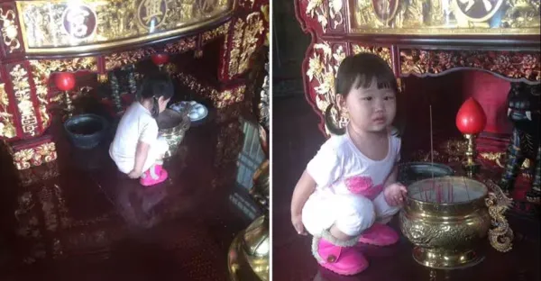 拜虎爺突然蹲下!!3歲女兒「用手扶著金爐」五官全皺成團,媽媽看清後「秒腿軟下跪」:不知者無罪!