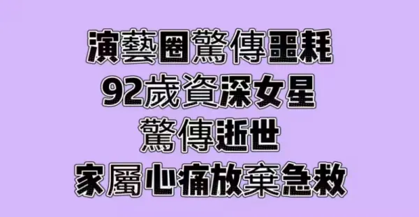 演藝圈驚傳噩耗!!! 92歲資深女星驚傳逝世,家屬心痛放棄急救