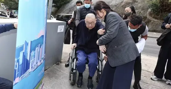 74歲劉鑾雄坐輪椅現身,需甘比攙扶起身,保鏢助理共五人相伴在旁