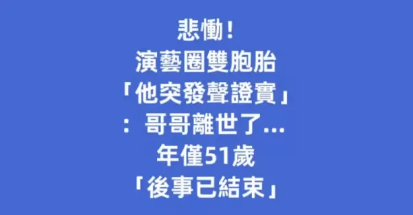 悲慟!!! 演藝圈雙胞胎「他突發聲證實」哥哥離世了... 年僅51歲「後事已結束」