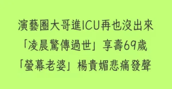 快訊/演藝圈大哥進ICU再也沒出來「凌晨驚傳過世」享壽69歲「螢幕老婆」楊貴媚悲痛發聲