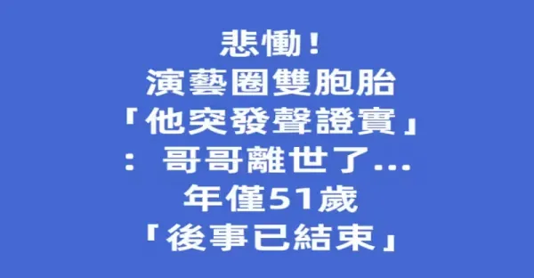 演藝圈悲慟!!! 演藝圈雙胞胎「他突發聲證實」:哥哥離世了... 年僅51歲「後事已結束」