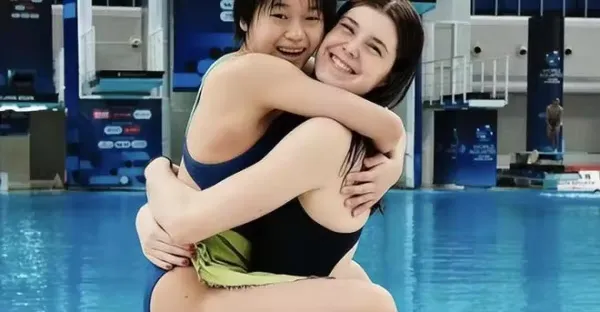 跳水運動員齊聚水立方,英國好閨蜜熊抱全紅嬋,兩人笑的燦爛
