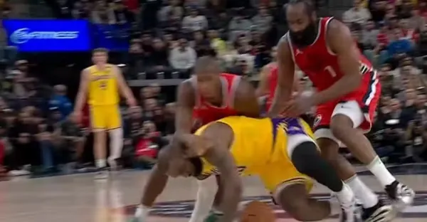 哈登輸不起!背後暗勁推倒詹皇,勒布朗捂頭砸地,東契奇笑容消失