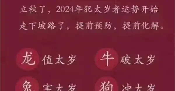 2024年犯太歲4個屬相一覽表,2024年有哪些生肖犯太歲