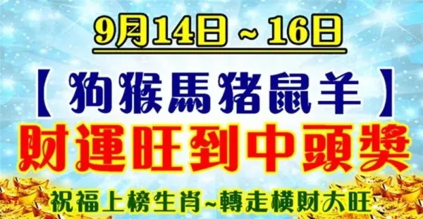 9月14日~16日(狗猴馬豬鼠羊)運旺到中頭獎