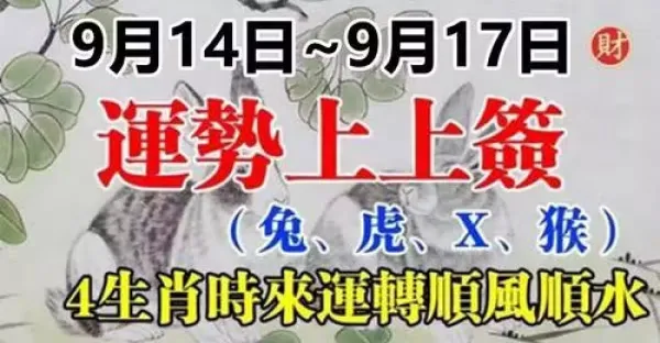 9月14日~9月17日運勢呈上上簽(兔 虎 X 猴)時來運轉順風順水