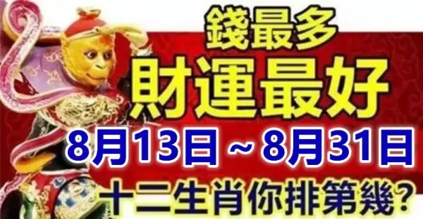 8月13日~8月31日錢最多,財運最好的十二生肖排行