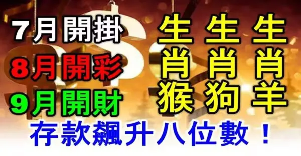 7月開掛,8月開彩,9月開財(生肖猴,生肖狗,生肖羊)存款飆升八位數