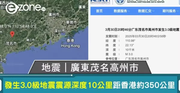 廣東茂名高州市發生3.0級地震,震源深度10公里距香港約350公里