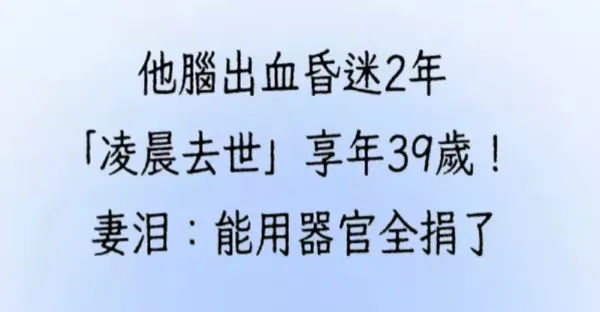 他腦出血昏迷2年「凌晨去世」享年39歲!妻淚:能用器官全捐了