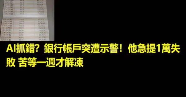 AI抓錯?銀行帳戶突遭示警!他急提1萬失敗 苦等一周才解凍