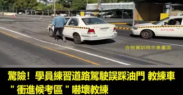 驚險!學員練習道路駕駛誤踩油門 教練車"衝進候考區"嚇壞教練