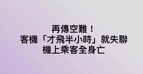 再傳空難!客機「才飛半小時」就失聯 機上乘客全身亡