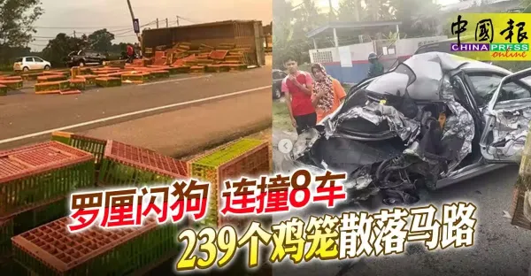 羅厘閃狗 連撞8車 239個雞籠散落馬路