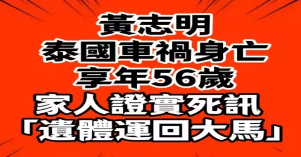 黃志明泰國交通事故身亡享年56歲 家人證實死訊「遺體運回大馬」